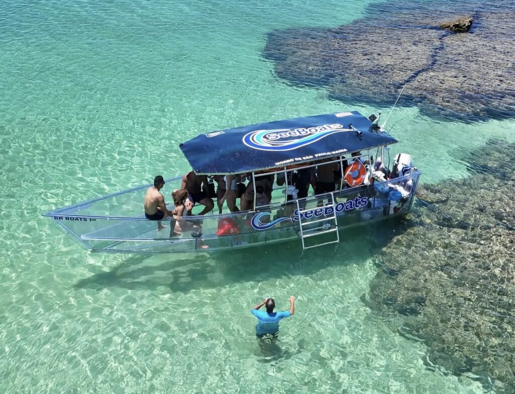 O passeio de lancha transparente é uma das experiências mais interessantes de Morro de São Paulo, oferecendo uma forma diferente de observar o mar e seus detalhes.